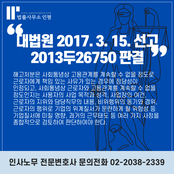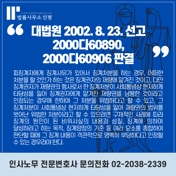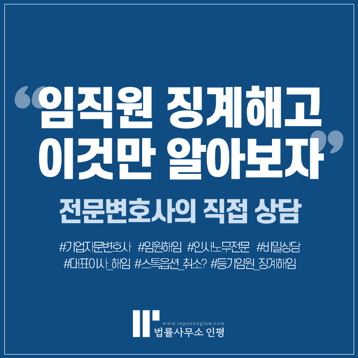 임원 및 근로자의 징계와 해고, 그 대응방안까지 이와 관련하여 법률 자문이 필요하시면 언제든지 아래의 링크를 통해 법률사무소 인평에 문의 주시기 바랍니다.