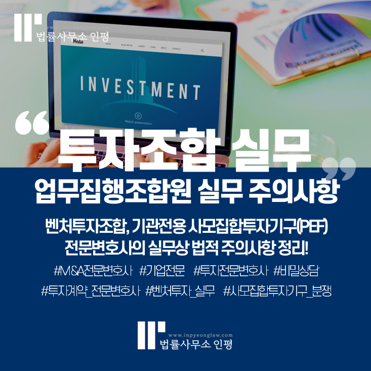 법률사무소 인평은 벤처펀드·기관전용 사모집합투자기구 운용 전반에 걸친 법률 자문을 제공하며, 이해상충 이슈부터 정관 제‧개정, LP 대응, 감독당국 소명 자료 준비까지 원스톱 솔루션을 제시합니다.  펀드 청산을 앞두고 투자자산의 매각을 검토 중이시라면, 인평의 변호사들과 함께 규제 리스크를 최소화하고 최적의 EXIT 전략을 수립하시기 바랍니다.  끝.
